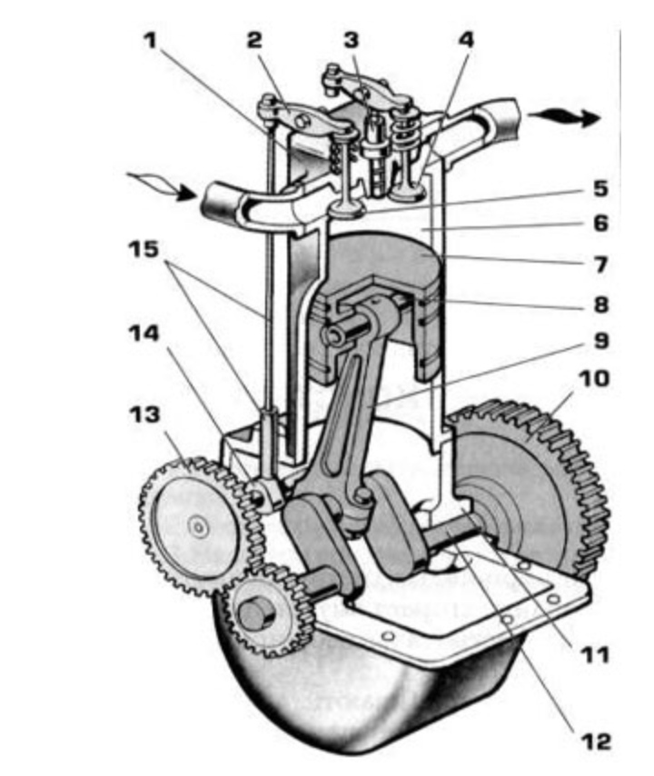Одна из основных деталей двигателя — цилиндр 6, в котором находится поршень 7, соединенный через шатун 9 с коленчатым валом 12. При перемещении поршня в цилиндре вверх и вниз его прямолинейное движение шатун и кривошип преобразуют во вращательное движение коленчатого вала.