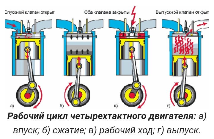 Работа двигателя складывается из совокупности процессов, протекающих в цилиндрах двигателя с определённой последовательностью. Эти процессы называют рабочим циклом и состоит из тактов впуска, сжатия, рабочего хода и выпуска. Подробнее в статье «Принцип работы ДВС. Рабочие циклы двигателя.»